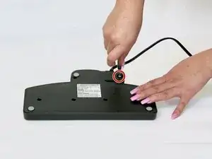 Переверните напольное зарядное устройство так, чтобы винты и наклейка были обращены к вам