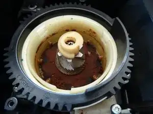 Теперь можно удалить подачу зёрен (маленькая белая улитка). Конус для измельчения и привод теперь также можно осторожно поднять.