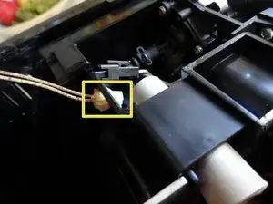 Нажмите на фиксирующую защёлку на разъёме белого кабеля сенсора и вытащите чёрный разъём вперёд от машины.