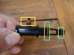 Если два зеленых O-образных кольца больше не герметизируют должным образом, клапан не будет работать. Замените уплотнения.