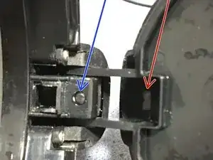 Вторая картинка показывает увеличенный участок петли. Когда кнопка на ручке нажата, маленький круглый пластиковый штифт (синяя стрелка) выскакивает, а когда крышка закрыта, он нажимает на прямоугольный штифт в крышке (красная стрелка). Этот прямоугольный штифт должен отводить зажимы.