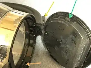 Понимание механизма крышки: Первая картинка. Когда нажимается кнопка на ручке (жёлтая стрелка), два зажима с каждой стороны крышки (зелёная стрелка) должны отводиться от двух отверстий (оранжевая стрелка), позволяя крышке, работающей на пружинах, открываться.