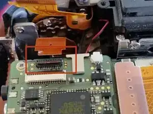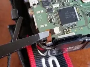 Чтобы отсоединить соединительный гибкий кабель, можно использовать что‑то, чтобы зафиксировать его вверху (в примере использована CF-карта), или просто подержать его другой рукой.