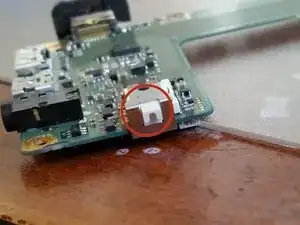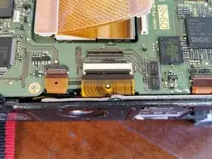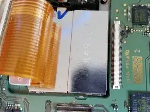 Далее удалите гибкий кабель в нижнем левом углу. У него нет фиксирующей планки, поэтому вытяните его пинцетом или пальцами.