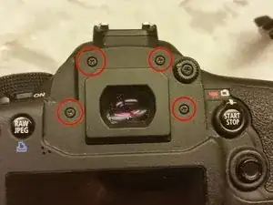 Далее необходимо выкрутить четыре верхних винта. Они находятся за видоискателем.