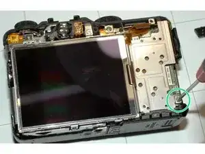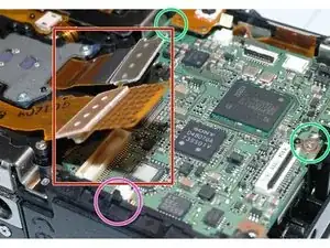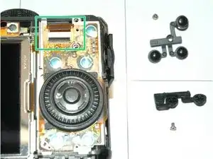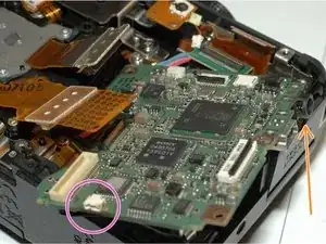 Следующий шаг — снятие печатной платы. Я допустил ошибку, не обратив внимания на выключатель отсека батареи. Если быть неосторожным, чёрный рычажок сломается. Это не критично — камера будет работать и с открытым отсеком для батареи.