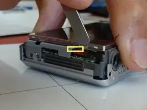 Используйте медиатор или пластиковый монтажный инструмент, чтобы снять заднюю крышку. Начните рядом с крышкой USB и проведите инструментом вдоль корпуса камеры. Поднимите заднюю панель и снимите её.