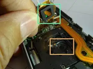На изображении CCD отмечен зелёным, а задняя часть объектива — оранжевым. При внимательном рассмотрении можно увидеть пылинки.