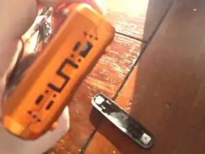 Переверните устройство и удалите дополнительный длинный винт рядом с местом крепления шнурка.