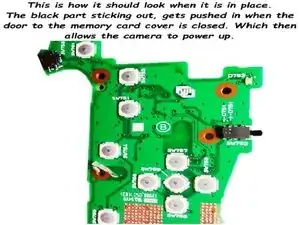 Что выпало, так это микропереключатель, который выпал из одной из печатных плат. Он выглядел нормально, но откуда он пришел? Тогда я достал схему для S9100/9600. После долгого изучения я пришел к выводу, что это может быть детектор, который сообщает основной плате, что дверь отсеков для карты памяти не закрыта. Я снял задний корпус и добрался до платы Key PWB ASSY, и там было место для этого переключателя. Он был установлен так, что несколько миллиметров кнопки нажимались бы наружу, разрывая контакт, когда дверь для карты памяти была открыта. Когда дверь закрывалась, она нажимала кнопку внутрь, позволяя камере нормально включаться.