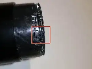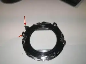 Обратите внимание, что длинный пластиковый наконечник крышки должен войти в отверстие, отмеченное оранжевым цветом, при сборке объектива.