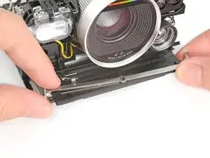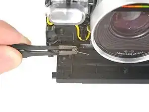 Поместите пружину на штифт вдоль правого края рамки, непосредственно под вспышкой.