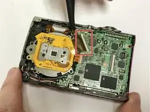 С помощью пинцета поднимите чёрную фиксирующую заслонку для большого шлейфа, соединяющего материнскую плату с объективом.