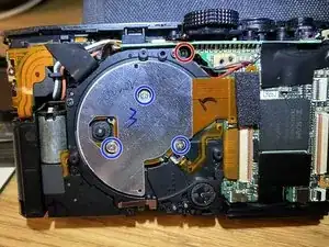 Только для тех, кто переносит матрицу CMOS: удалите три винта, отмеченные синим кружком. Модуль матрицы, кабеля и экранирования представляет собой единый блок, который поднимается наружу. Если вы хотите извлечь только матрицу и оставить объектив на месте, на этом шаге вы закончите!