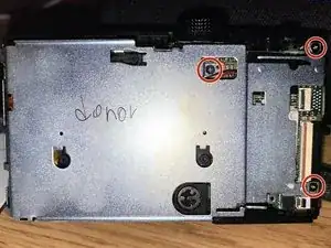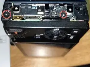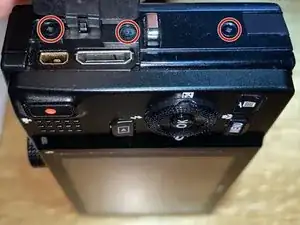 Удалите два внутренних серебристых винта ближе к стороне экрана камеры. Не удаляйте третий винт непосредственно рядом с разъемом для шнурка!