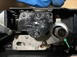 Винт кнопки затвора на изображении не показан. Он находится на передней стороне камеры, как указано зеленой пунктирной стрелкой.