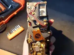 В данном процессе разбирается лишь передняя часть видоискателя (та, что выступает из передней крышки). Она была снята для очистки. Для дальнейшей разборки видоискателя потребуется паяльник. Мне не было необходимости разбирать его так глубоко.