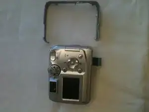 Найдите серую дорожку, из которой вы удалили винты; она удерживает две половины камеры вместе. Используйте инструмент для ремонта iPod, чтобы приподнять серую дорожку и удалить её.