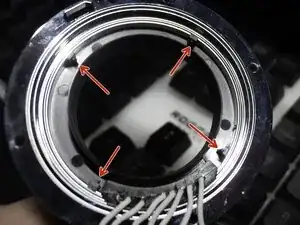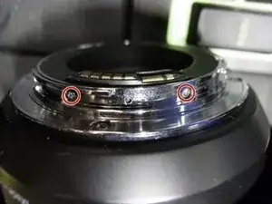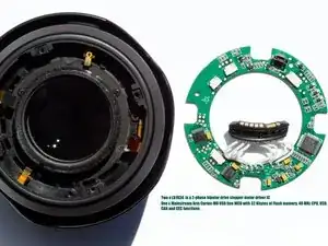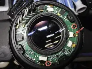 После того как Вы сняли заднюю крышку с переключателем AF/MF, аккуратно снимите оставшиеся плоские шлейфы. Затем снимите два винта крепления платы, отмеченные кружком, с помощью
