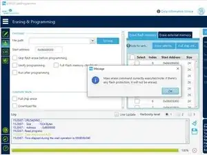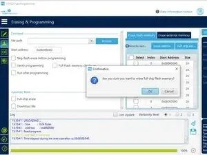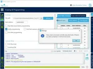 Теперь нажмите вторую сверху зелёную кнопку слева, выбрав «Erasing and Programming». В центре справа на вкладке «Erase Flash Memory» нажмите Full Erase. (Изображение 1) Нажмите OK для удаления. После завершения операции появится сообщение (Изображение 2)