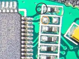 BOOT0: На картинке 2 видно, где трасса BOOT0 (вывод 44) выходит с обратной стороны платы и подключается к подтягивающему вниз резистору 10 кОм! Чёрный () Вывод 36 под ней — это VDDIO2 и находится на 3.3 вольта! Оранжевый (). Подключение подтягивающего резистора 1 кОм сюда и к удобной шине 3.3 В переводит MCU в DFU режим.