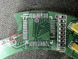 Изуродовано!: На картинке 3 показана плата без MCU (выглядит сильно испорченной). Красный квадрат показывает, где я брал 3.3 В, а розовые кружки — где трасса BOOT0 исчезает под MCU и где она выходит. [См. страницу переделки]