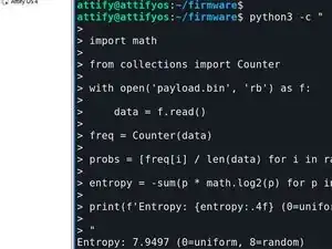 Я работал с прошивкой в Linux‑виртуальной машине, но когда дальше идти стало нельзя, я обратился к ИИ; он предложил получить значение энтропии с помощью binwalker. После анализа файла он вернул меня в консоль и дал Python‑скрипт для расчёта энтропии — 7.9497.