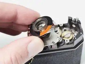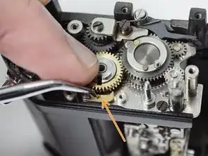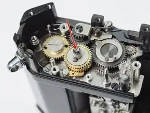 На шестерне перемотки передней шторы есть небольшая втулка. Удалите её, чтобы она случайно не отвалилась.
