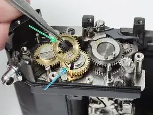 Большая шестерня слева вращается от рычага перемотки на верхней части камеры.