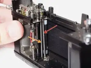 Длинный серебристый рычаг — рычаг натяжения зеркала. Он подталкивает чёрный стержень к верхней части пазa при взводе камеры, что заряжает основную пружину зеркала.