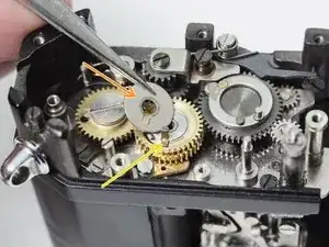 В конце экспозиции большая чёрная шестерня толкает спусковой рычаг, возвращая зеркало в положение просмотра.