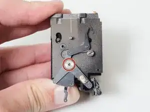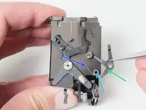 Длинный серебристый рычаг — это рычаг зарядки зеркала. Он поднимает черный штифт в верхней части прорези, когда камера взведена, что заряжает основную зеркальную пружину.