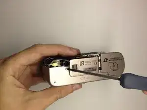 Включите камеру и поднимите модуль вспышки, чтобы найти винт модуля вспышки.