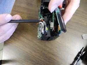 Отпаяйте концы белого, красного и чёрного проводов, соединяющих элемент вспышки с печатной платой.