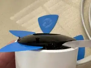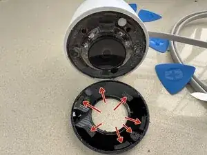 С помощью металлической лопатки работайте между белым пластиковым корпусом и прозрачным телом, чтобы поднять прозрачное тело. Будьте осторожны, чтобы не повредить синее уплотнительное кольцо.