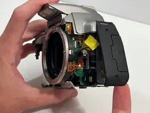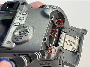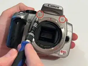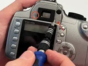 Смотрев на переднюю часть камеры, удалите 2 винта под вспышкой Canon с помощью отвертки Phillips #00.