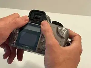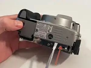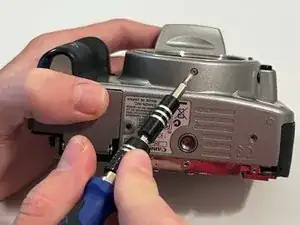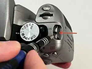 С правой стороны камеры открутите винт под кнопкой спуска затвора с помощью отвертки Phillips #00.