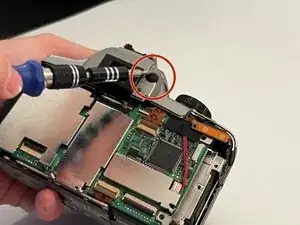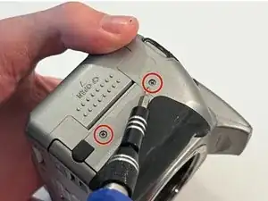 Поверните камеру на правую сторону и используйте отвертку Phillips #00, чтобы удалить 2 параллельных винта.
