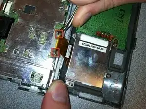 Осторожно извлеките оранжевую шлейф‑ленту из разъёма.