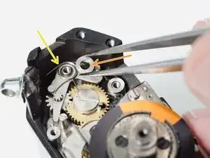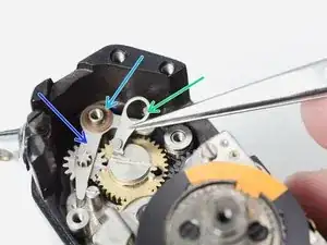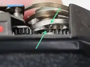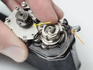 Подайте зубцы храповика внутрь, чтобы вовлечь их в зацепление с основной шестернёй перемотки. Натяжные пружины должны выглядеть так при правильной установке.