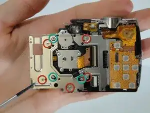 НОВОЕ: Шаги 8–11 (снятие узла ЖК) не обязательны и их можно пропустить!!! Вместо показанного шага вы можете получить доступ к модулю вспышки с боковой стороны камеры — открутив его от металлического кронштейна, прикреплённого к внутренней раме. (Кронштейн будет ясно виден после снятия задней и передней крышек — фото нет.) Обратите внимание, что модуль вспышки также прикреплён к кронштейну двумя маленькими выступами на пластиковом корпусе; после отвинчивания аккуратно оттяните модуль от кронштейна, чтобы освободить выступы.