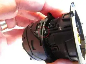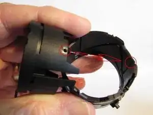 При сборке обратите внимание на отверстие в блоке диафрагмы и стабилизации изображения и на выемку во втором держателе линзы, расположенную в корпусе управления зумом. Они должны совпадать. Три выступа на блоке диафрагмы и стабилизации входят в прорезные выступы второго держателя линзы.
