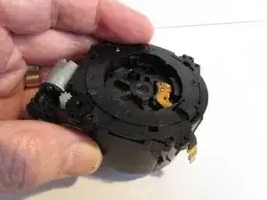 Уложив объектив лицевой стороной вниз на стол, втяните его в закрытое положение, поворачивая зубья шестерни в противоположном направлении. Уберите винт, который вы временно вставили.