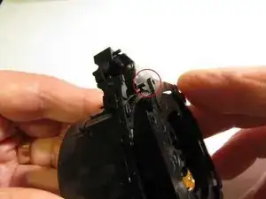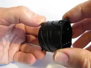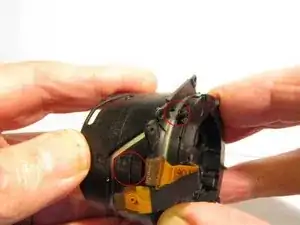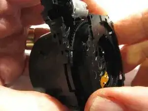 Поверните зубчатую секцию по часовой стрелке внутри внешней секции настолько, насколько это возможно. Это перемещает привод вспышки вперёд, после чего зубчатую секцию можно частично вынуть.