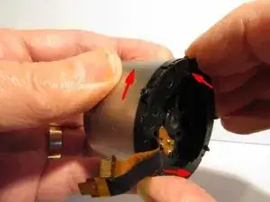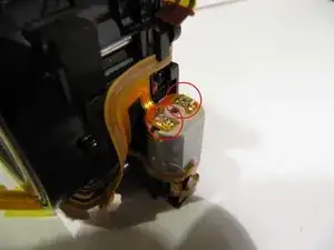 Подайте питание на мотор от батарейного блока 3 В, подключив его к двум клеммам на моторе. Подайте положительный контакт на клемму с передней стороны объектива, чтобы выдвинуть его, или на клемму со стороны задней части объектива, чтобы втянуть. (Держите все шлейфы в стороне — случайная подача питания не в то место может что-то повредить.)