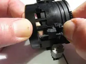 Полностью вынуть зубчатую секцию теперь можно, сжав её и растянув внешнюю секцию, чтобы два выступа в приводе вспышки вышли из пазов зубчатой секции.