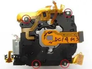 Запомните исходное положение головок трёх винтов и выкрутите их, считая количество оборотов для каждого. Оставшийся клей делает их тугими — аккуратно не сорвите головки. Осторожно отведите датчик изображения в сторону, держите объектив лицевой стороной вниз на рабочем столе.
