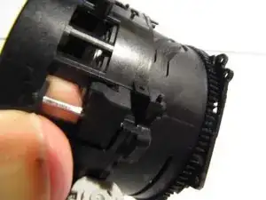 Поднимите объектив со стола и с помощью небольшой плоской отвёртки аккуратно поверните зубья шестерни, с которыми сцеплялась последняя шестерня привода зума, пока объектив не откроется примерно наполовину.