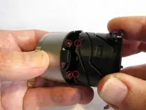 Временно вставьте один из четырёх винтов, чтобы удерживать конструкцию, пока вы выдвигаете объектив для пропуска лент через их паз. Закройте объектив снова перед установкой задней крышки.