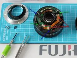 Теперь у вас хороший доступ к внутреннему реальному фокусировочному кольцу. Я потратил время, добавляя дополнительную смазку в резьбу приводного механизма фокусировки. Вы можете вручную вращать это кольцо, чтобы изменить положение фокусного модуля.